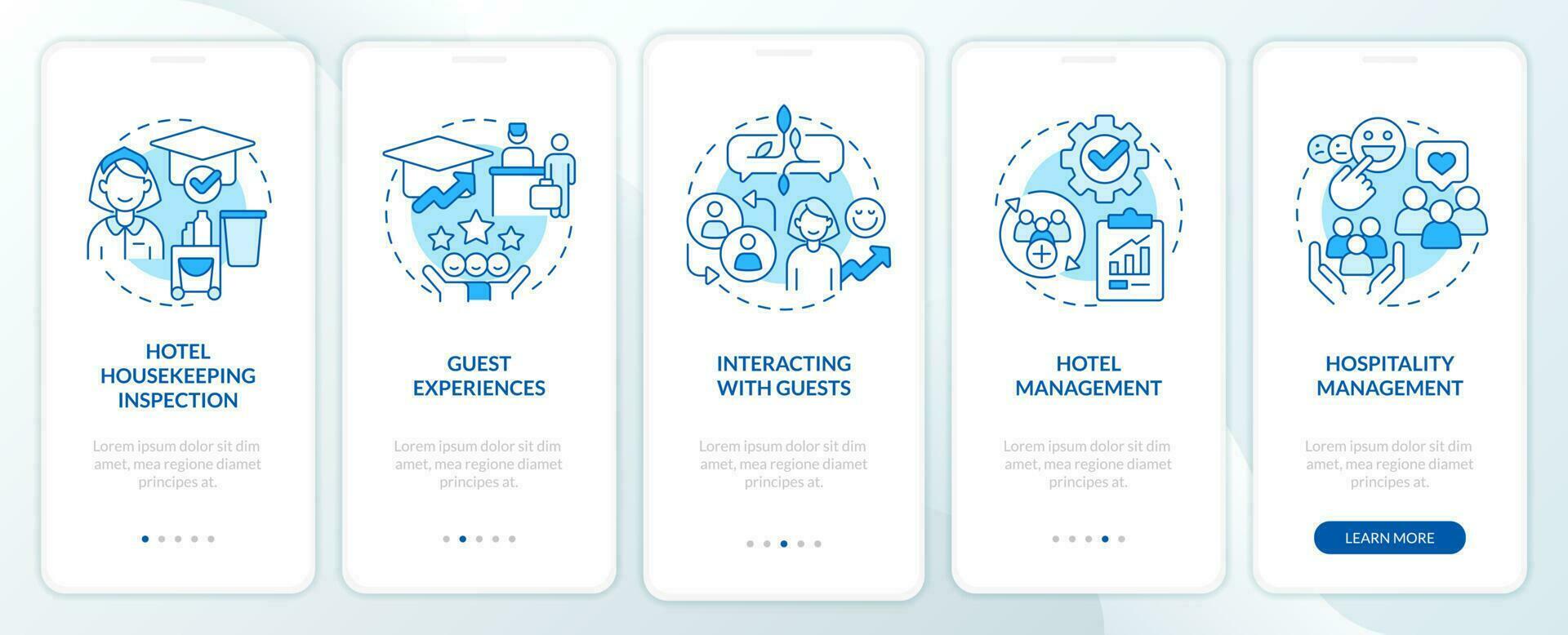 Hospitality training courses blue onboarding mobile app screen. Walkthrough 5 steps editable graphic instructions with linear concepts. UI, UX, GUI template Pro Vector