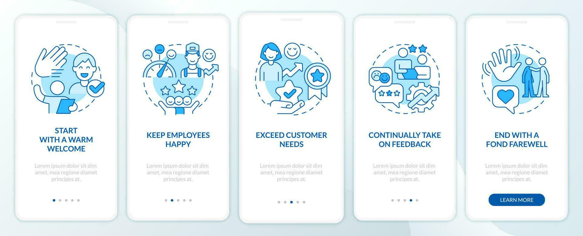 Improving hotel customer service blue onboarding mobile app screen. Walkthrough 5 steps editable graphic instruction with linear concepts. UI, UX, GUI template Pro Vector