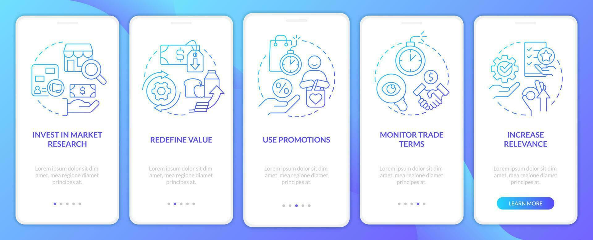 Managing prices blue gradient onboarding mobile app screen. Inflation walkthrough 5 steps graphic instructions with linear concepts. UI, UX, GUI template Pro Vector