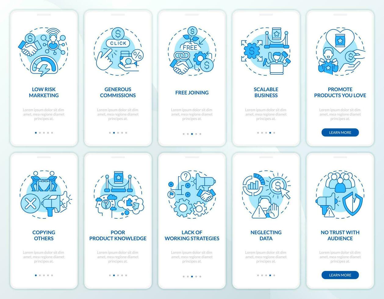 Affiliate marketer work blue onboarding mobile app screens set. Walkthrough 5 steps editable graphic instructions with linear concepts. UI, UX, GUI template Pro Vector and Pro SVG