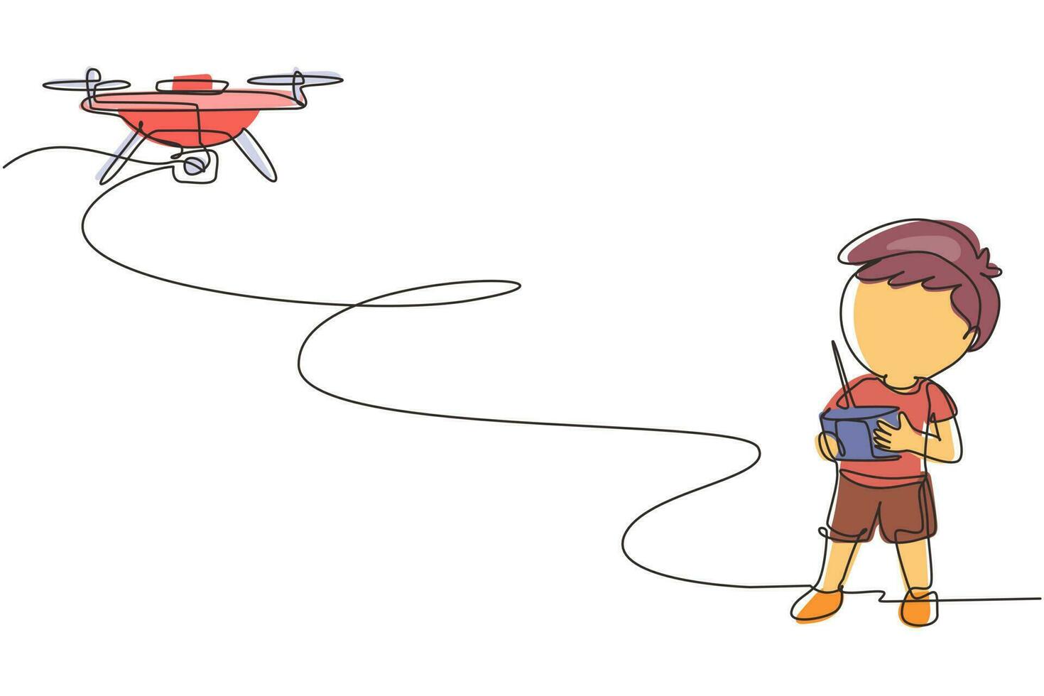 Single one line drawing boy with remote control drone. Kid playing with quadcopter. Happy child controlling flying robot camera drone. Modern continuous line draw design graphic vector illustration Pro Vector