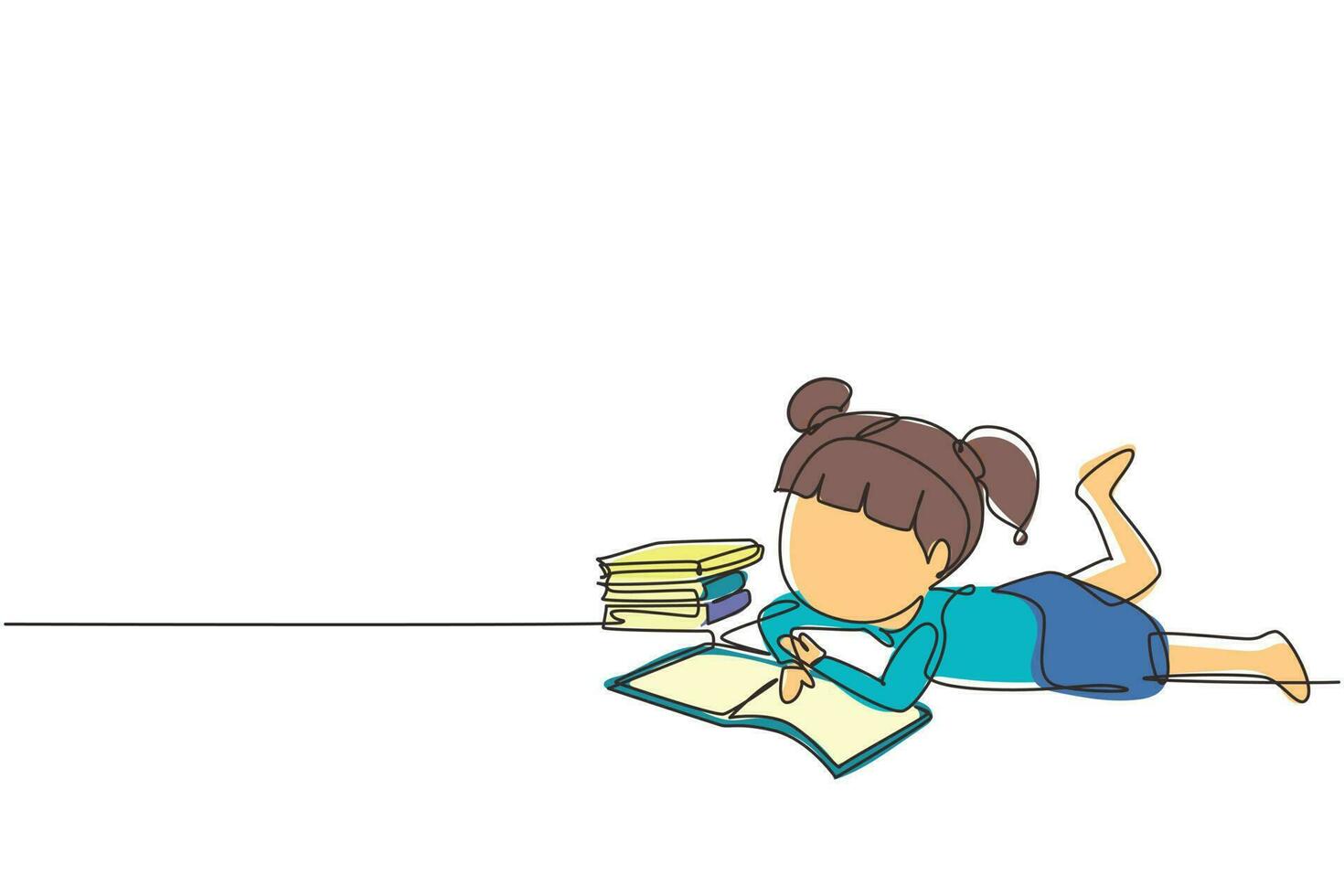 Single continuous line drawing little baby girl is reading book and dreaming lying on floor. Pile of books. Source of knowledge. Intelligent student. One line draw graphic design vector illustration Pro Vector