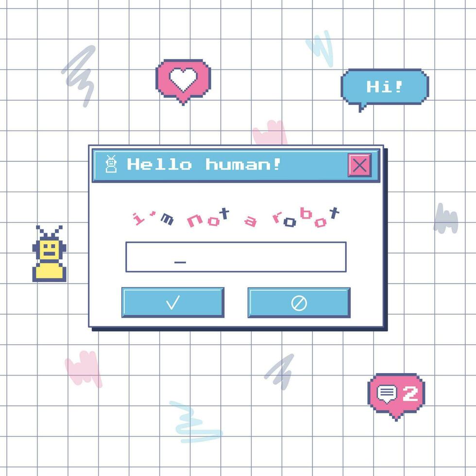 A dialog box with a robot check. A captcha window in style of an old computer. Nostalgic retro 90s user interface. Pixel stickers with icons. Vector illustration on a notebook sheet in a cage. Pro Vector