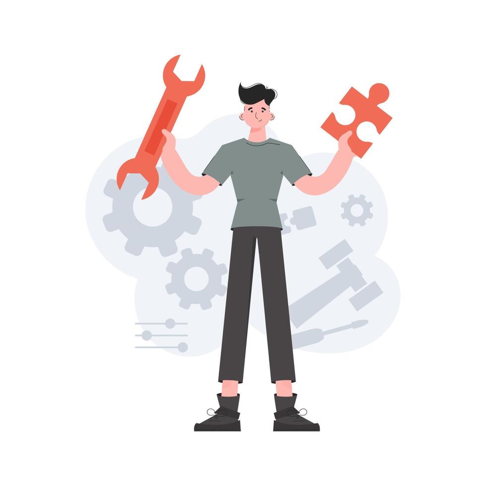 A man stands in full growth holding a wrench and a puzzle. Tech support. Element for presentations, sites. Pro Vector