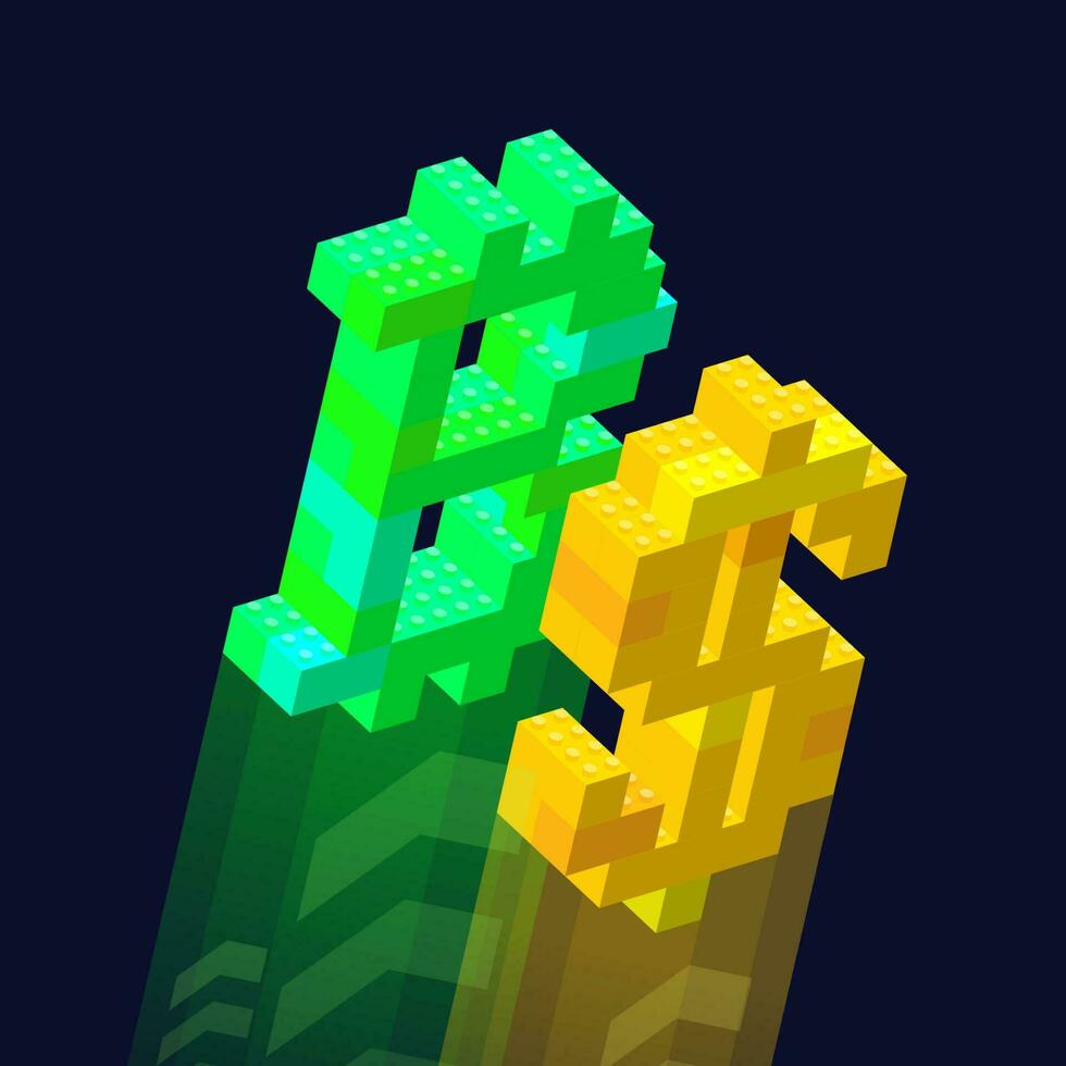 Concept of Bitcoin and Dollar signs assembled from plastic blocks in isometric style for print and design. Vector illustration. Pro Vector