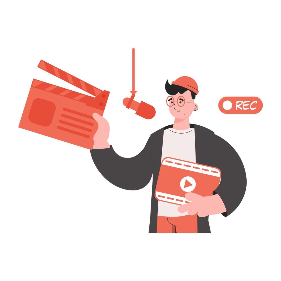 A man stands waist-deep with an open clapperboard. Isolated. Element for presentations, sites. Pro Vector