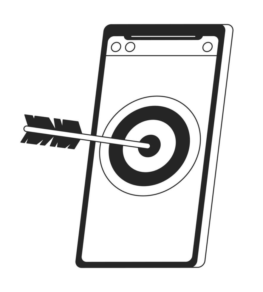 Target audience in mobile marketing bw concept vector spot illustration. Target arrow in smartphone 2D cartoon flat line monochromatic object for web UI design. Editable isolated outline hero image Pro Vector