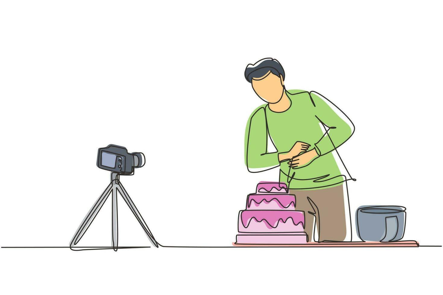 Single continuous line drawing influencer or food blogger creating content. Man shooting cooking video using camera on tripod. Chef baking and decorating cake at kitchen. One line draw design vector Pro Vector