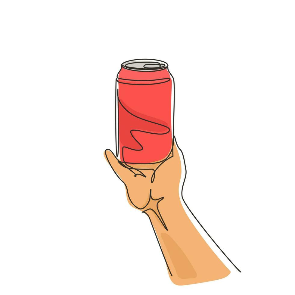 Single continuous line drawing hand holds a wet aluminum can. Realistic soda cans without labels on white background. Mock up template concept. Dynamic one line draw graphic design vector illustration Pro Vector