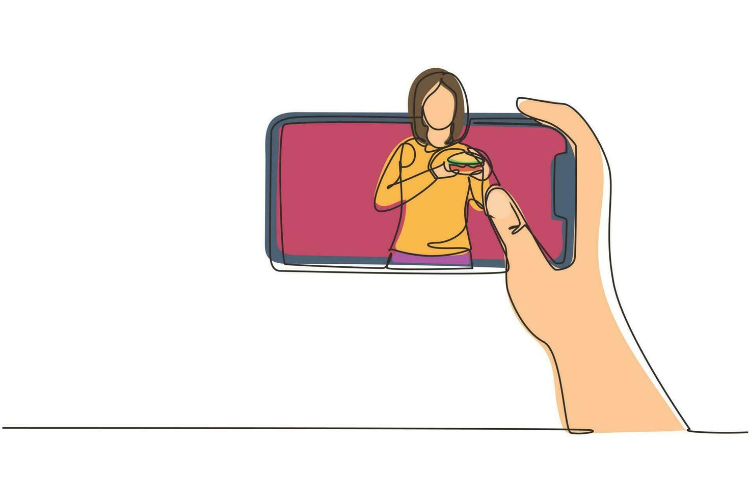 Continuous one line drawing woman food blogger eating burger while creating new content video for her channel by using smartphone. Food review blogger. Single line draw design vector illustration Pro Vector
