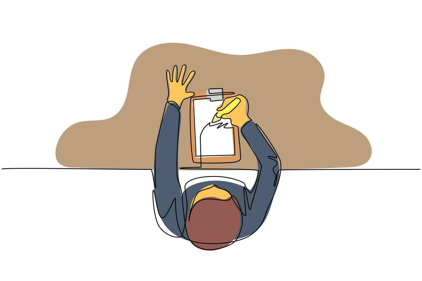 Continuous one line drawing top view of businessman writes completed checklist on clipboard. Concept of successful completion of tasks. Effective daily planning. Single line draw design vector graphic Pro Vector