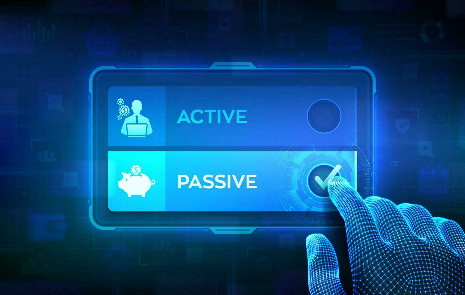 Active or Passive. Making decision. Passive income compare with active income earned through effort or output. Hand on virtual touch screen ticking the check mark on Passive button. Vector. Pro Vector