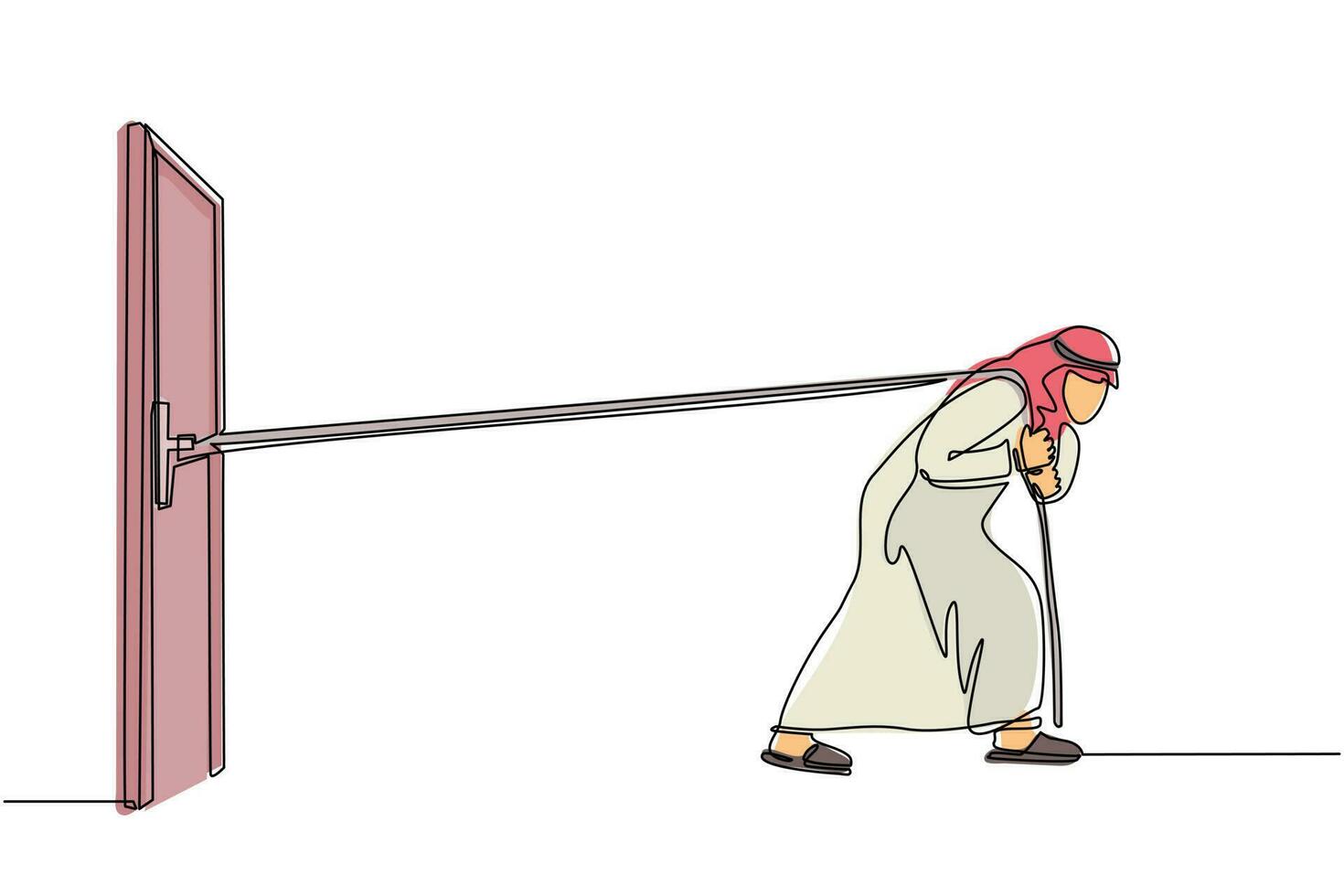 Single continuous line drawing Arabian businessman trying hard to pulling rope to drag heavy door, metaphor to facing big problem. Business struggles. Strength for success. One line draw design vector Pro Vector