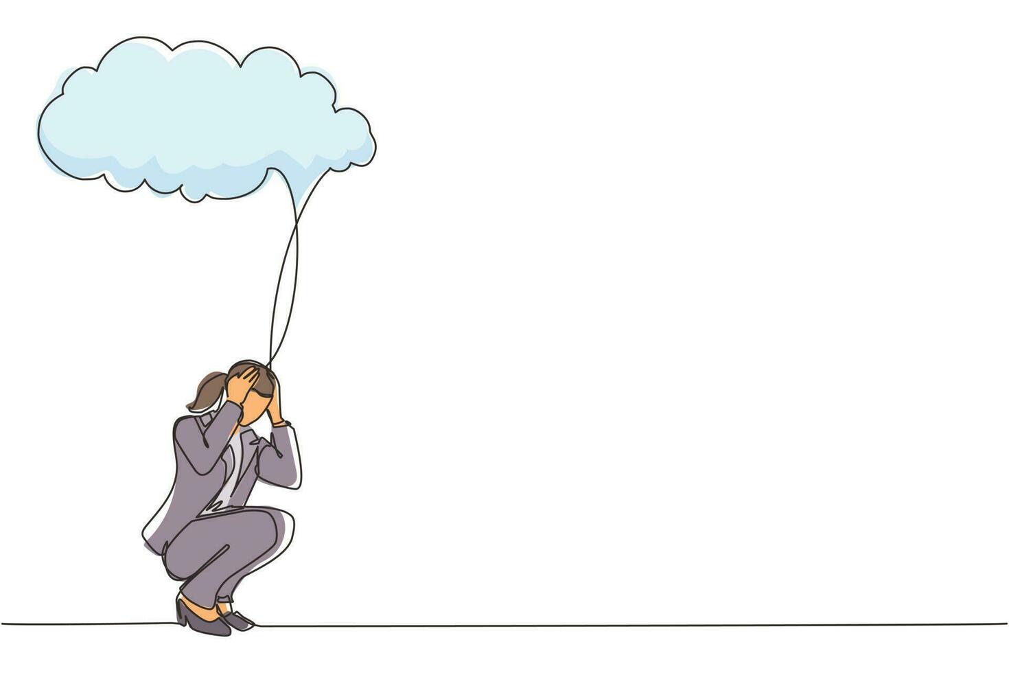 Single continuous line drawing businesswoman feeling sad, depression sitting under rain and cloud. Unhappy depressed loneliness sad worker in stress with problem. One line draw graphic design vector Pro Vector