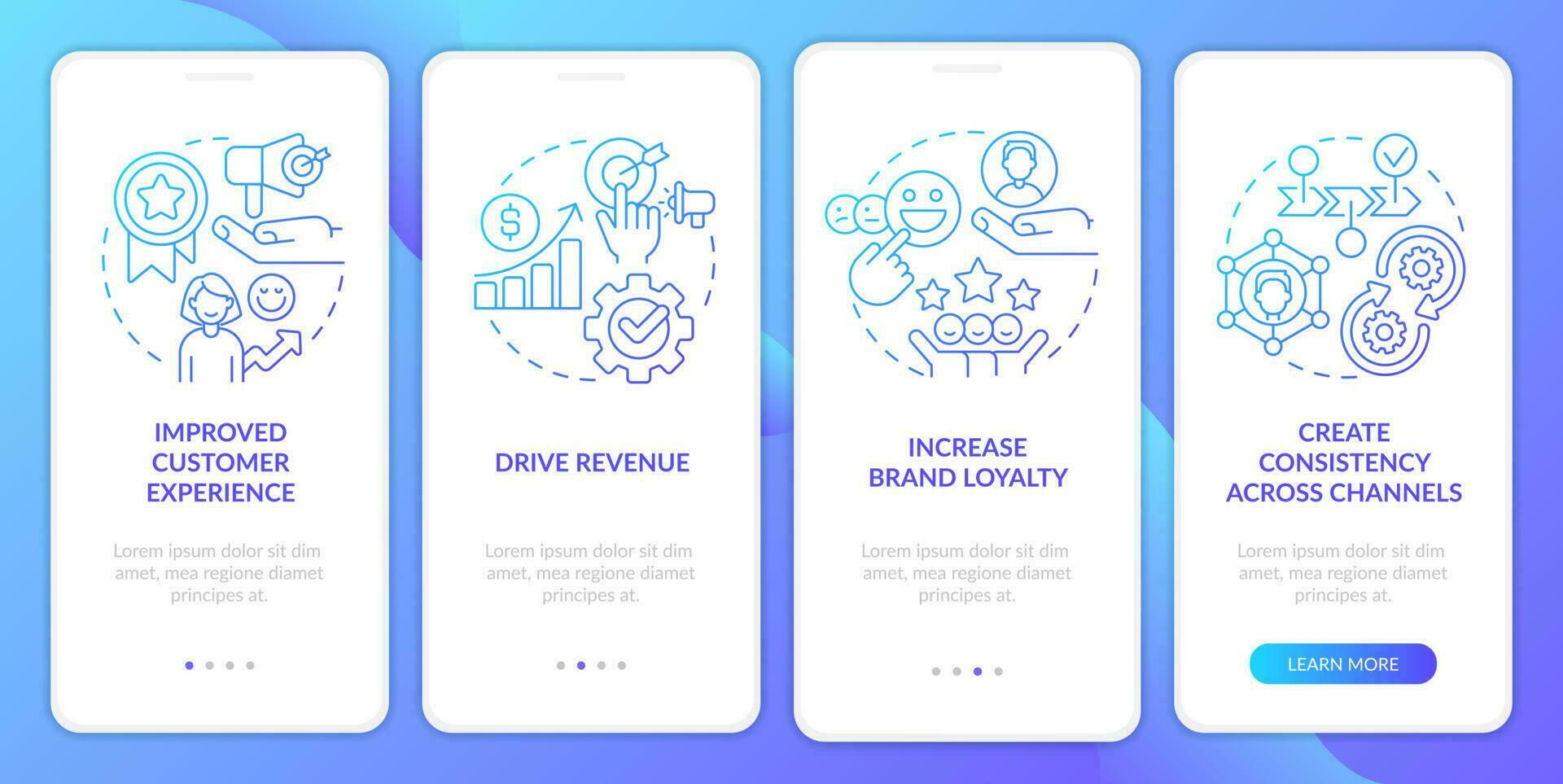 Personalized marketing achievement blue gradient onboarding mobile app screen. Walkthrough 4 steps graphic instructions with linear concepts. UI, UX, GUI template Pro Vector