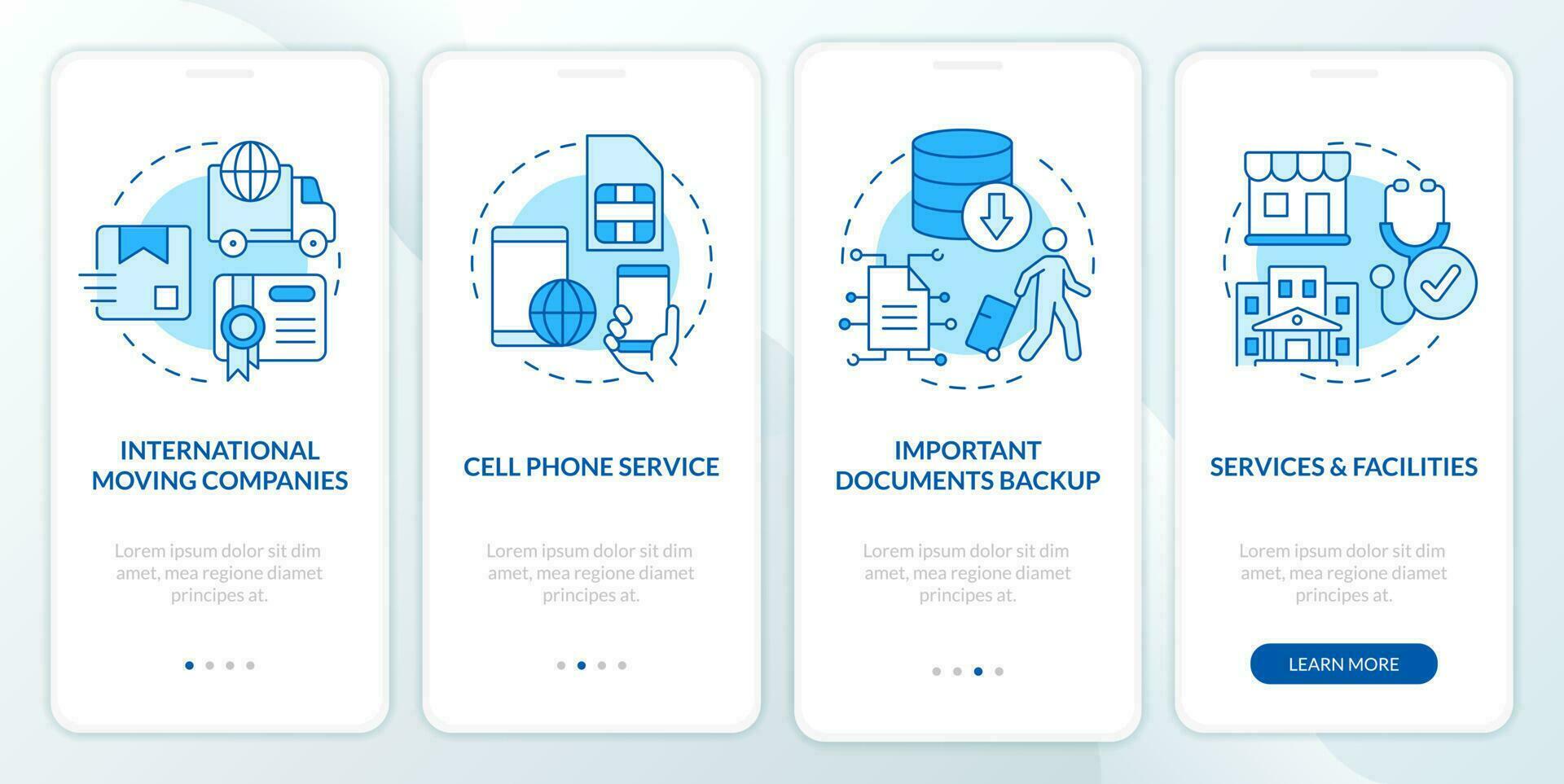 Prepare to live abroad blue onboarding mobile app screen. Immigration walkthrough 4 steps editable graphic instructions with linear concepts. UI, UX, GUI template Pro Vector and Pro SVG
