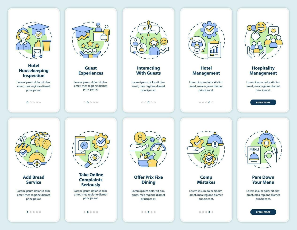 Training in hospitality industry onboarding mobile app screen set. Walkthrough 5 steps editable graphic instructions with linear concepts. UI, UX, GUI template Pro Vector