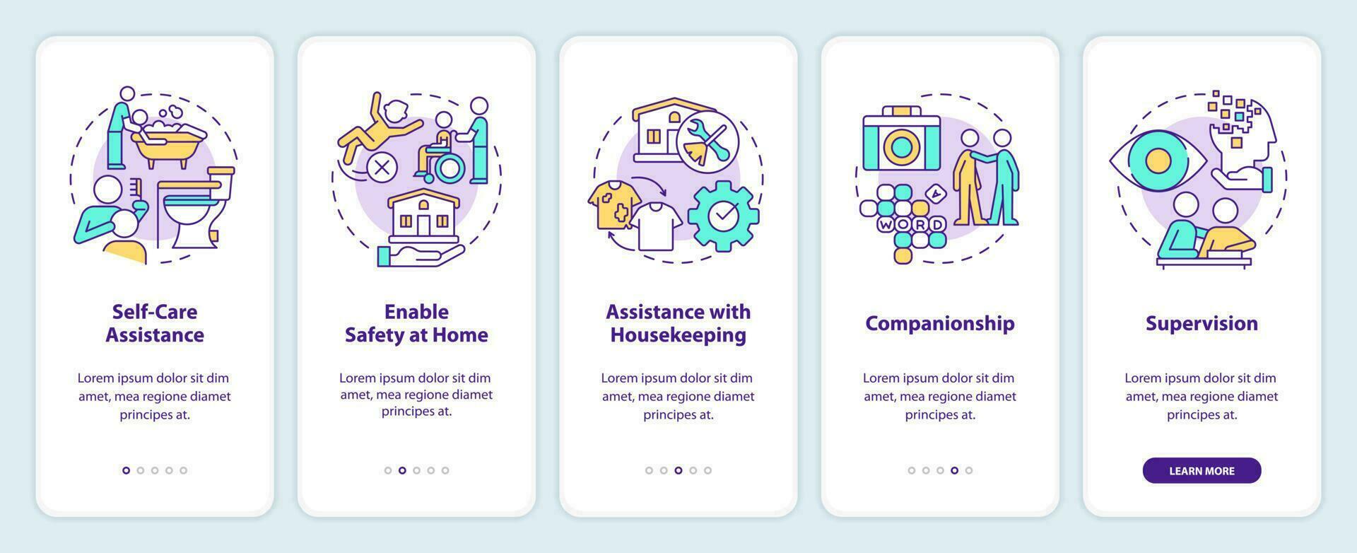 Personal care and companionship services onboarding mobile app screen. Walkthrough 5 steps editable graphic instructions with linear concepts. UI, UX, GUI template Pro Vector