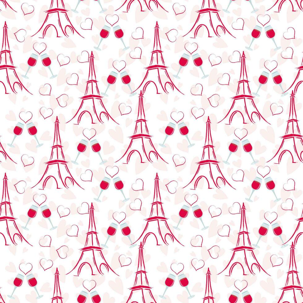 Heart Pattern Background With Sketching Eiffel Tower And Cheers Glass. Pro Vector