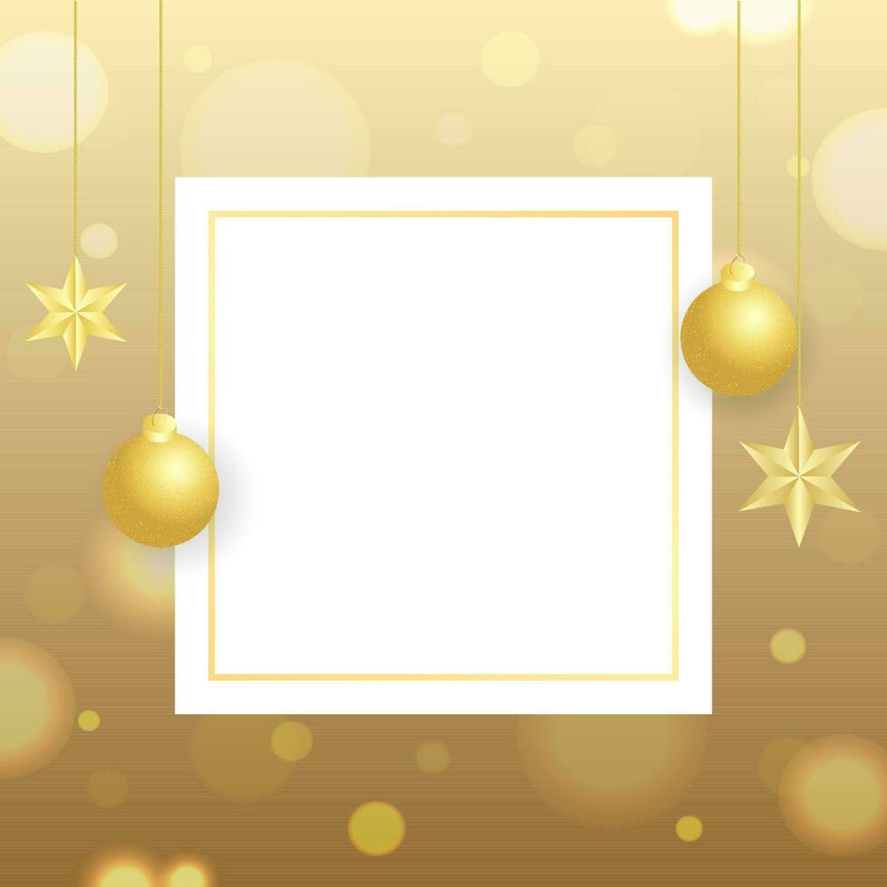 Greeting card design with hanging baubles and stars decorated on golden bokeh background with space for your text. Pro Vector