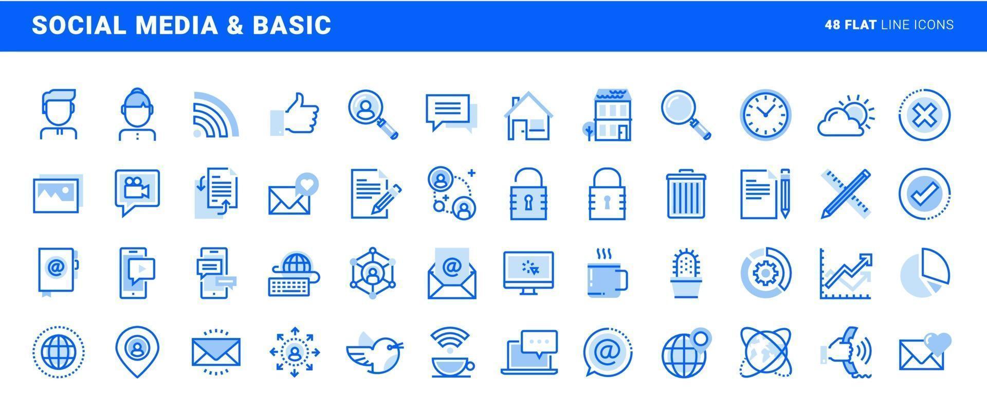 Set of social media and basic office flat line icons. Vector concepts for website and app design and development. Pro Vector