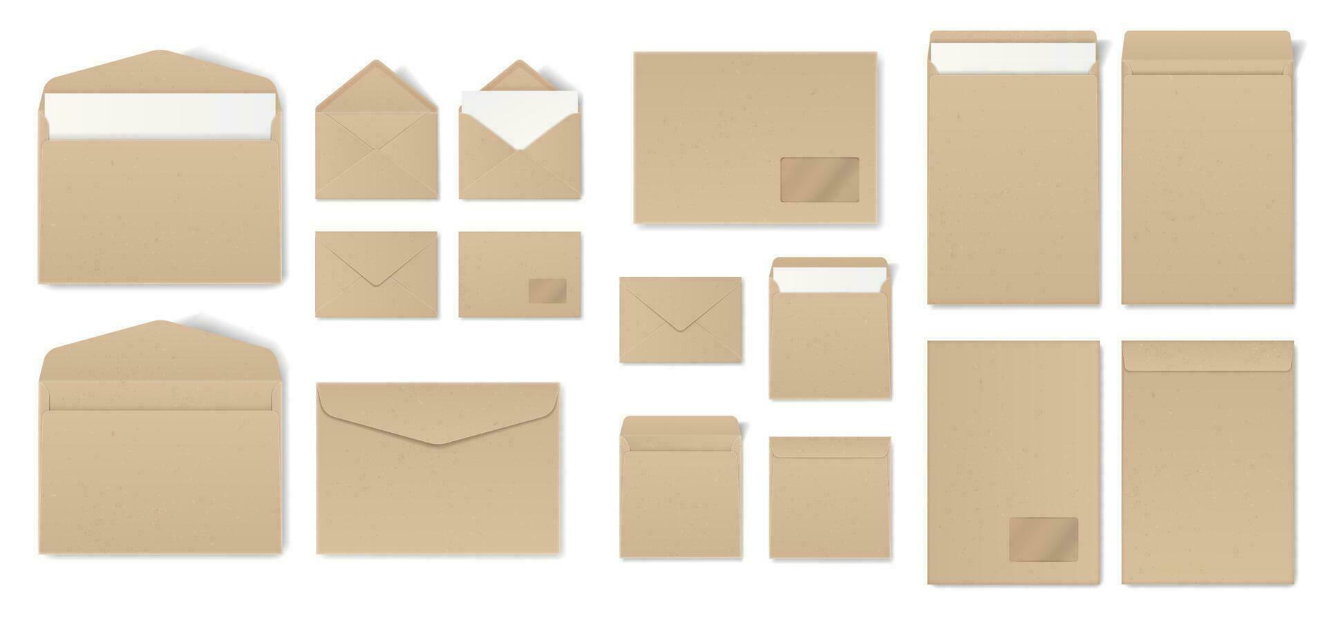 Realistic craft envelope with letters, open and closed envelopes mockups. Paper mail holder in different sizes, letter packaging vector set Pro Vector
