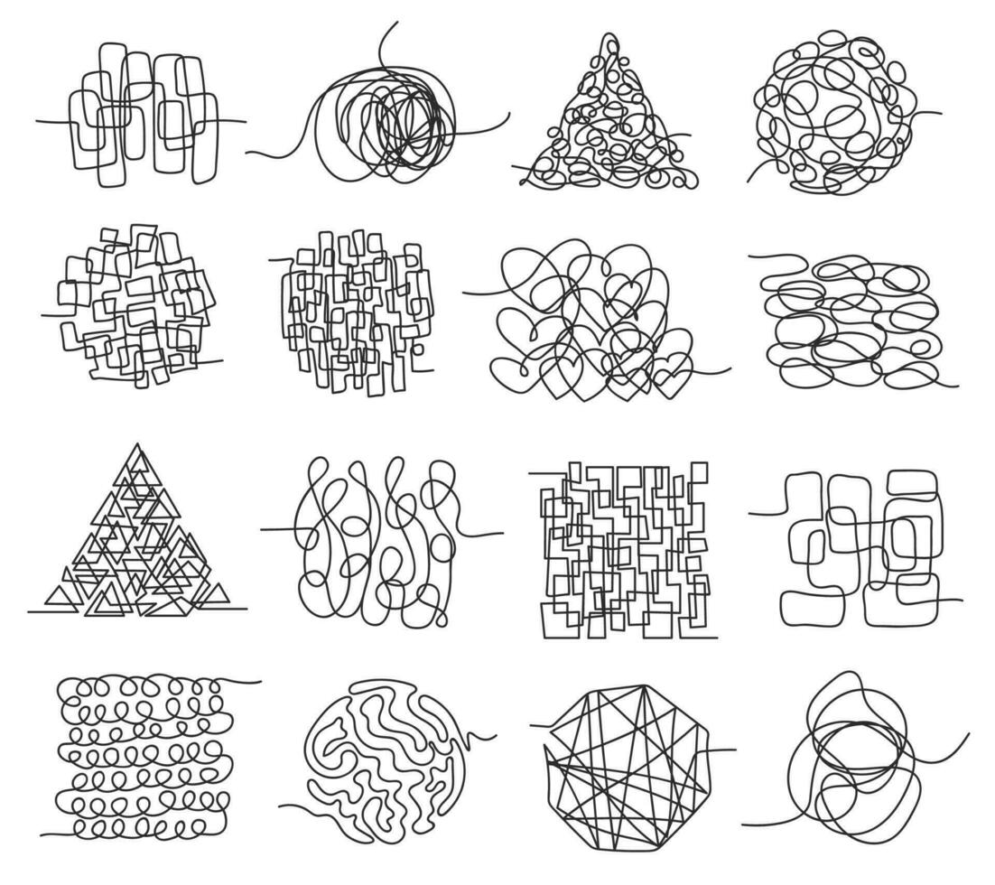 Tangled lines, chaos scribbles, messy squiggles and knots. Hand drawn chaotic doodles, entwined tangle scrawl, random scribble Vector set Pro Vector