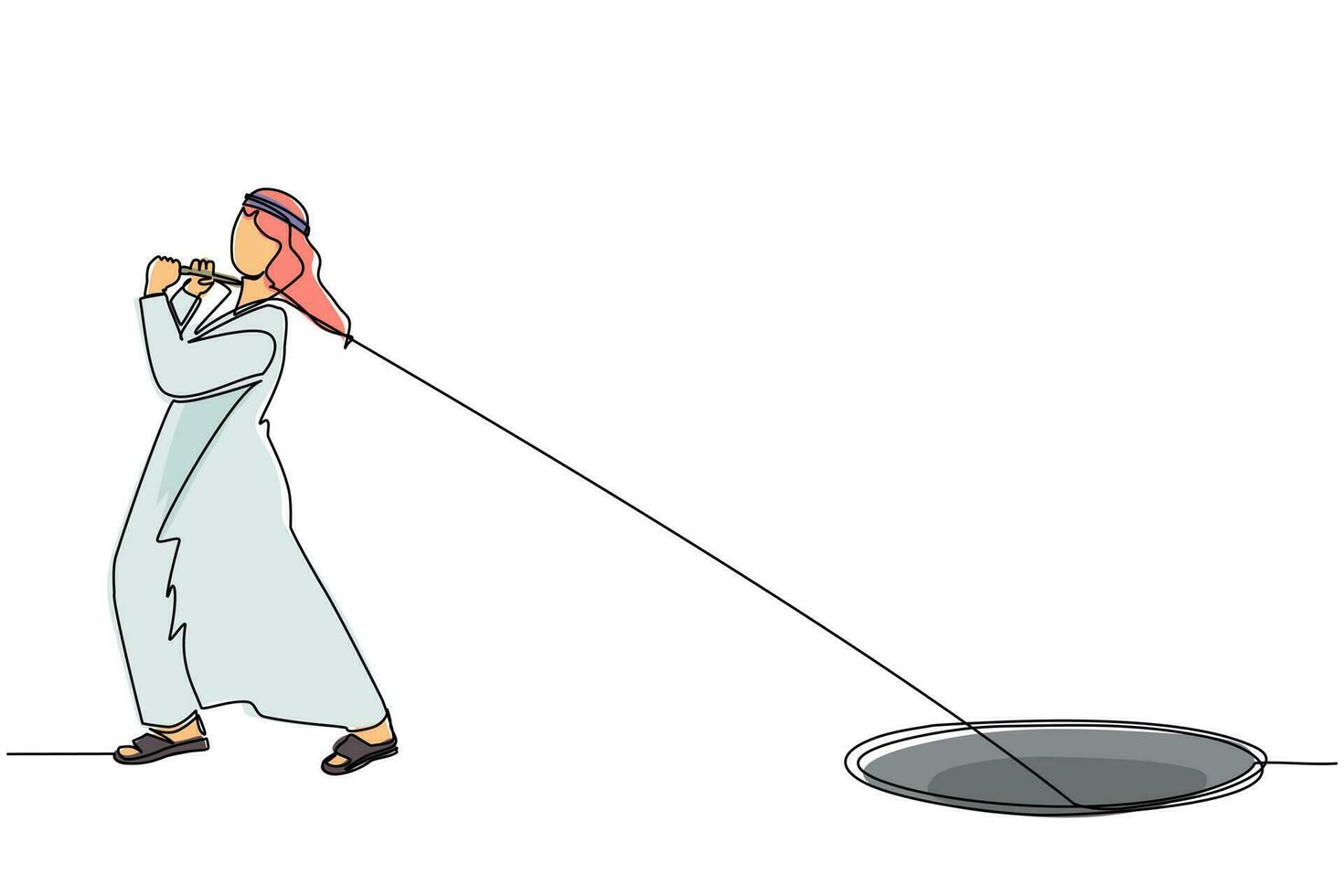 Single continuous line drawing Arabian businessman trying hard pulling rope to drag something from hole, metaphor to facing big problem. Business struggles. One line graphic design vector illustration Pro Vector