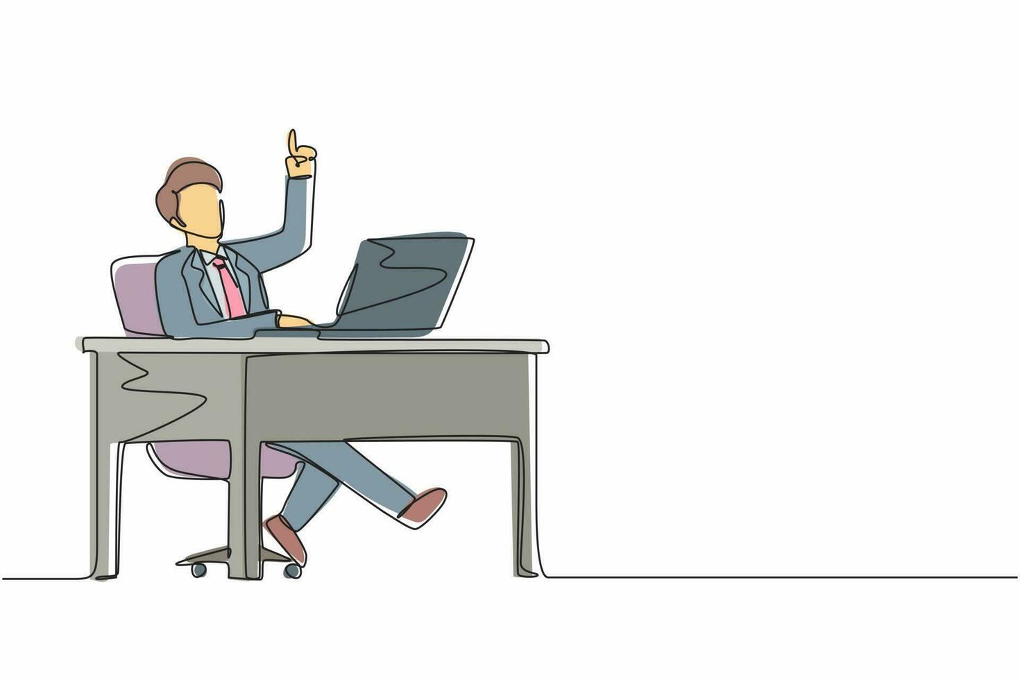 Single one line drawing businessman getting bright new idea while working with laptop on desk. Male manager working with computer at desk. People get idea. Modern continuous line draw design vector Pro Vector