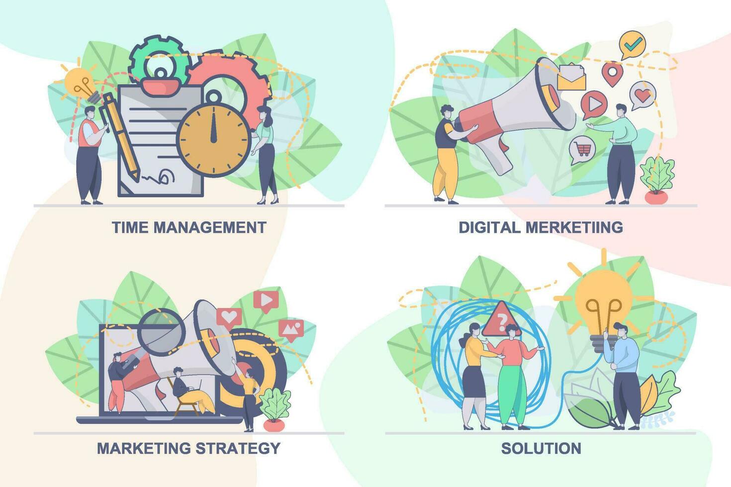 Set of web page design templates for time management, marketing strategy, digital marketing, solution. Modern vector illustration concepts for website and mobile website development. Pro Vector