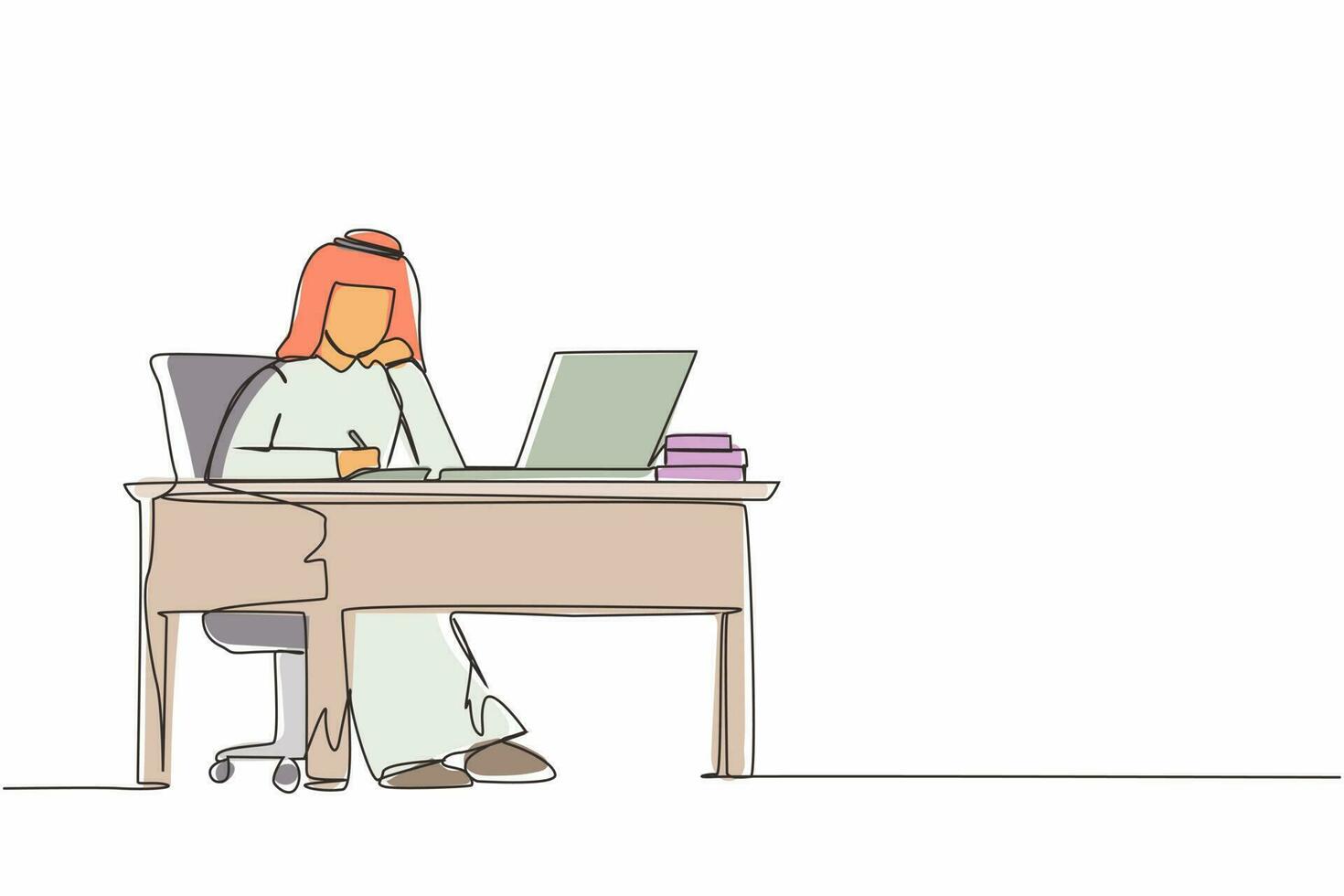Single continuous line drawing Arabic businessman writing sitting in front of laptop at table. Young male studying and writing in notebook, at desk in front of computer. One line graphic design vector Pro Vector