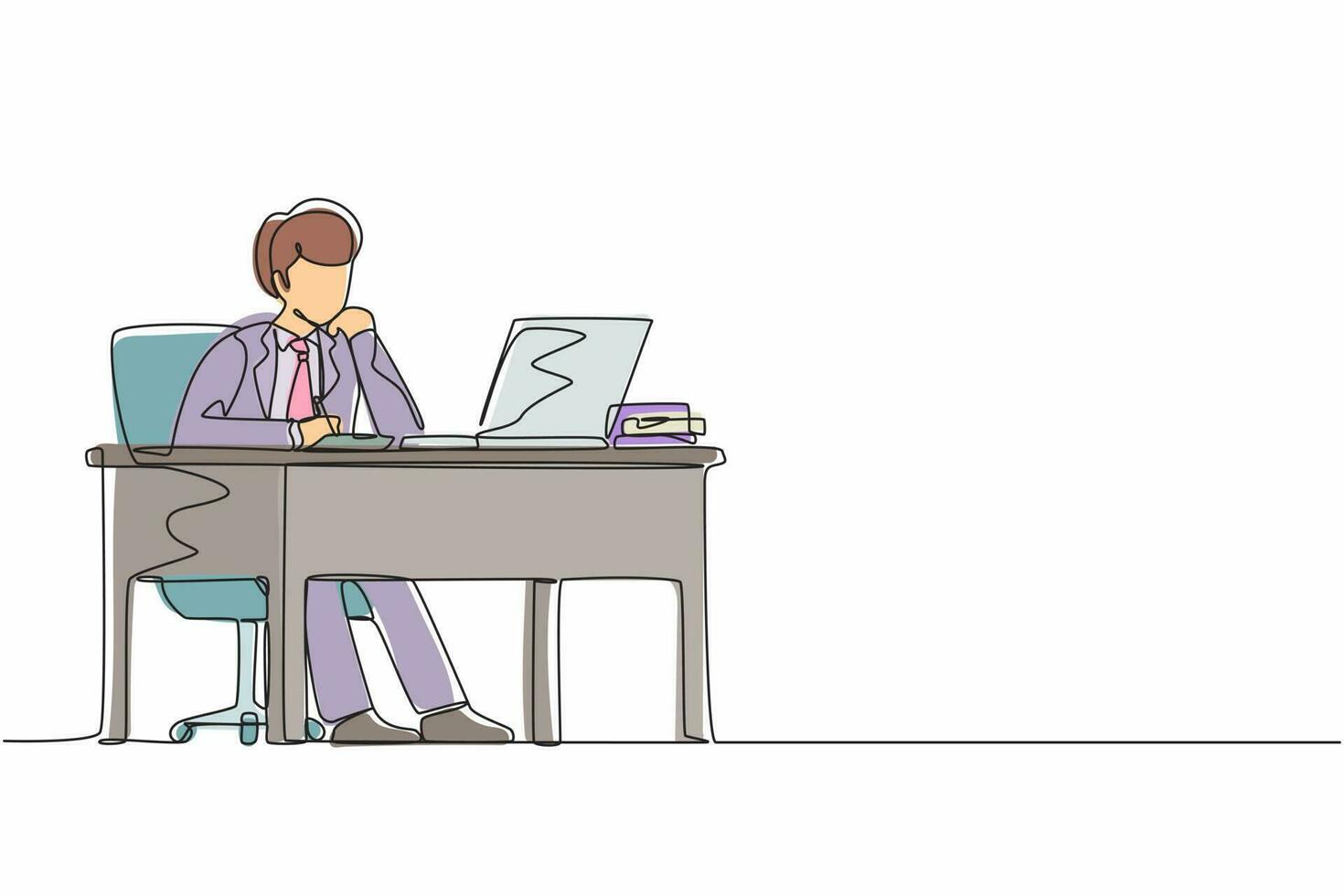 Single continuous line drawing businessman writing sitting in front of laptop at table. Young male studying and writing in notebook, at desk in front of computer. One line draw graphic design vector Pro Vector