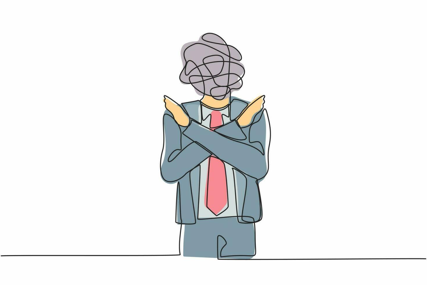 Single continuous line drawing businessman with round scribbles instead of a head. Office worker, making no hand sign or x symbol, crossing hands, rejection, displeased. One line graphic design vector Pro Vector