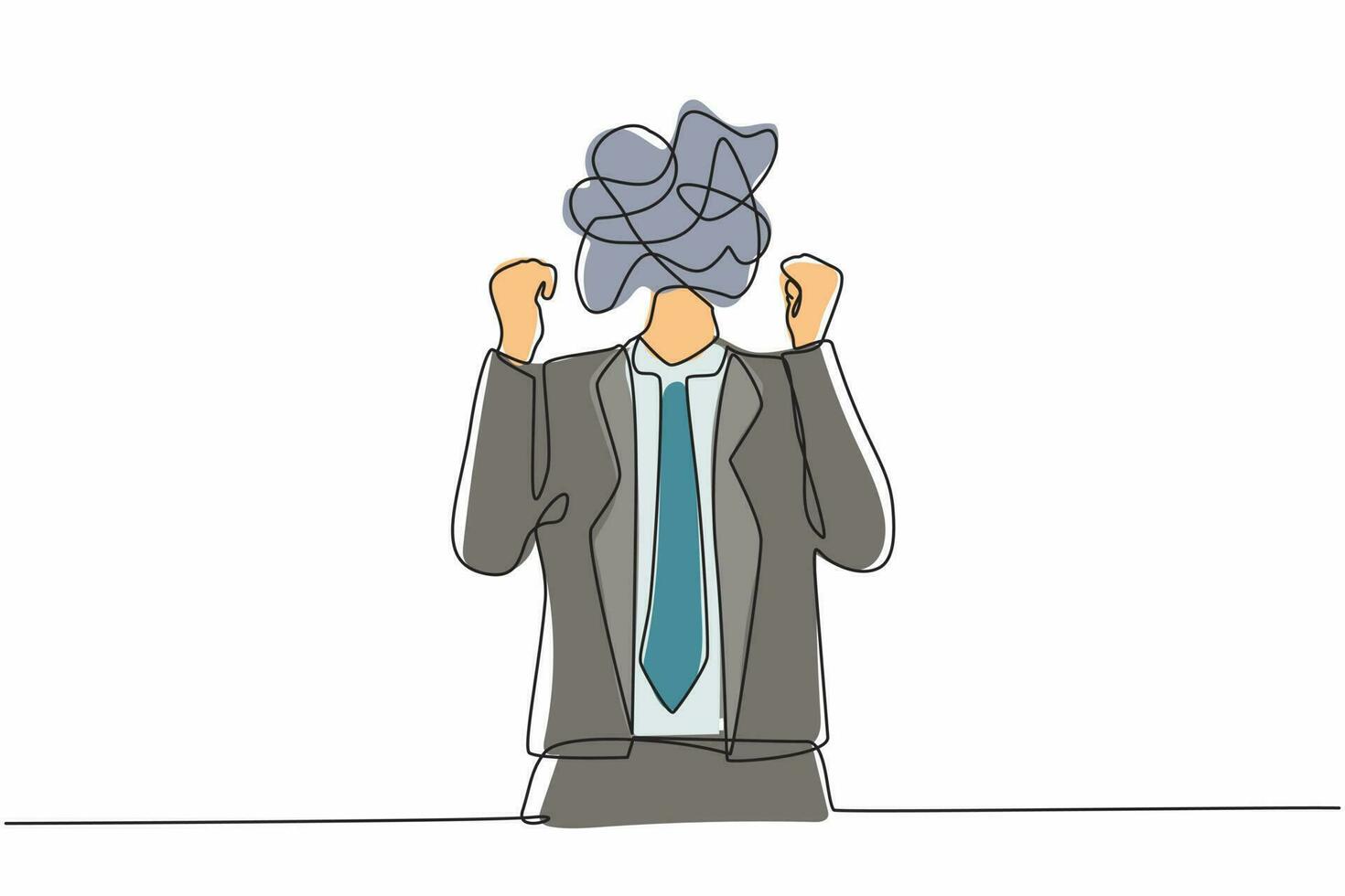 Single one line drawing businessman with round scribbles instead of a head. Angry man raised fist and shout or screaming expression. Man expresses negative emotions. Continuous line draw design vector Pro Vector