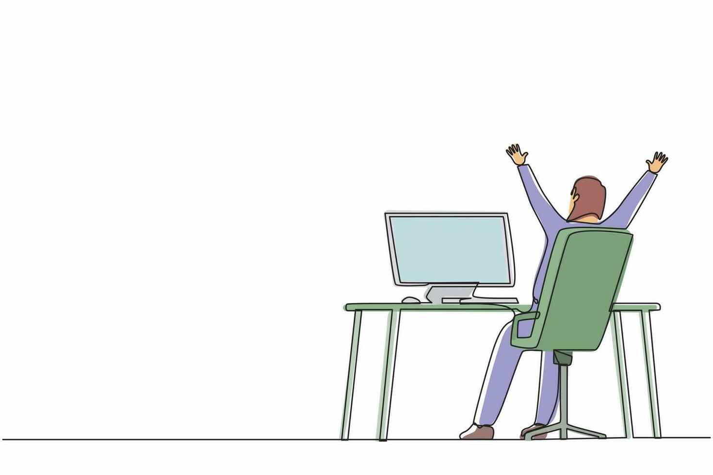 Single one line drawing back view happy woman completed task and triumphing with raised hands on her workplace. Successful well done work. Completed task. Continuous line draw design graphic vector Pro Vector