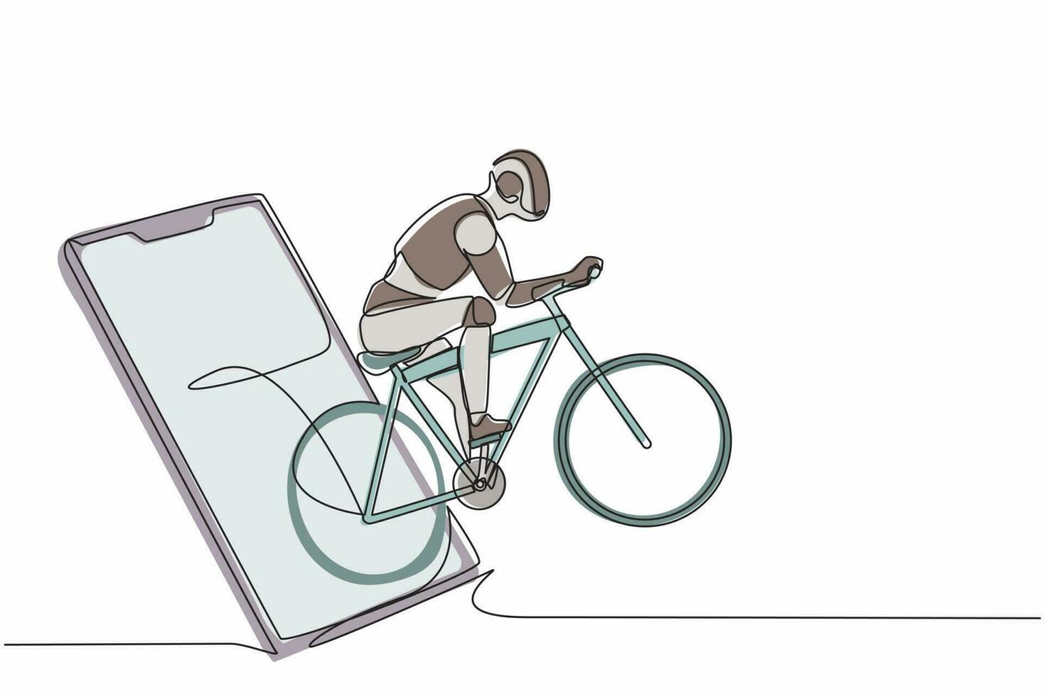 Single continuous line drawing robots come out from cellular phone and pedaling a road bike. Modern robotics artificial intelligence technology. Electronic technology. One line graphic design vector Pro Vector