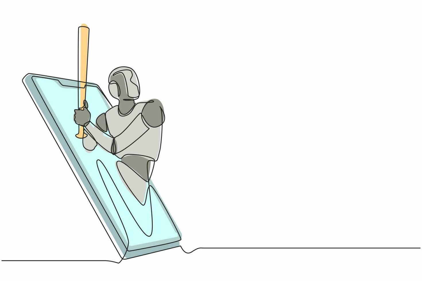 Continuous one line drawing robot come out from cellular phone with baseball player pose. Humanoid robot cybernetic organism. Future robotic development concept. Single line draw design vector graphic Pro Vector