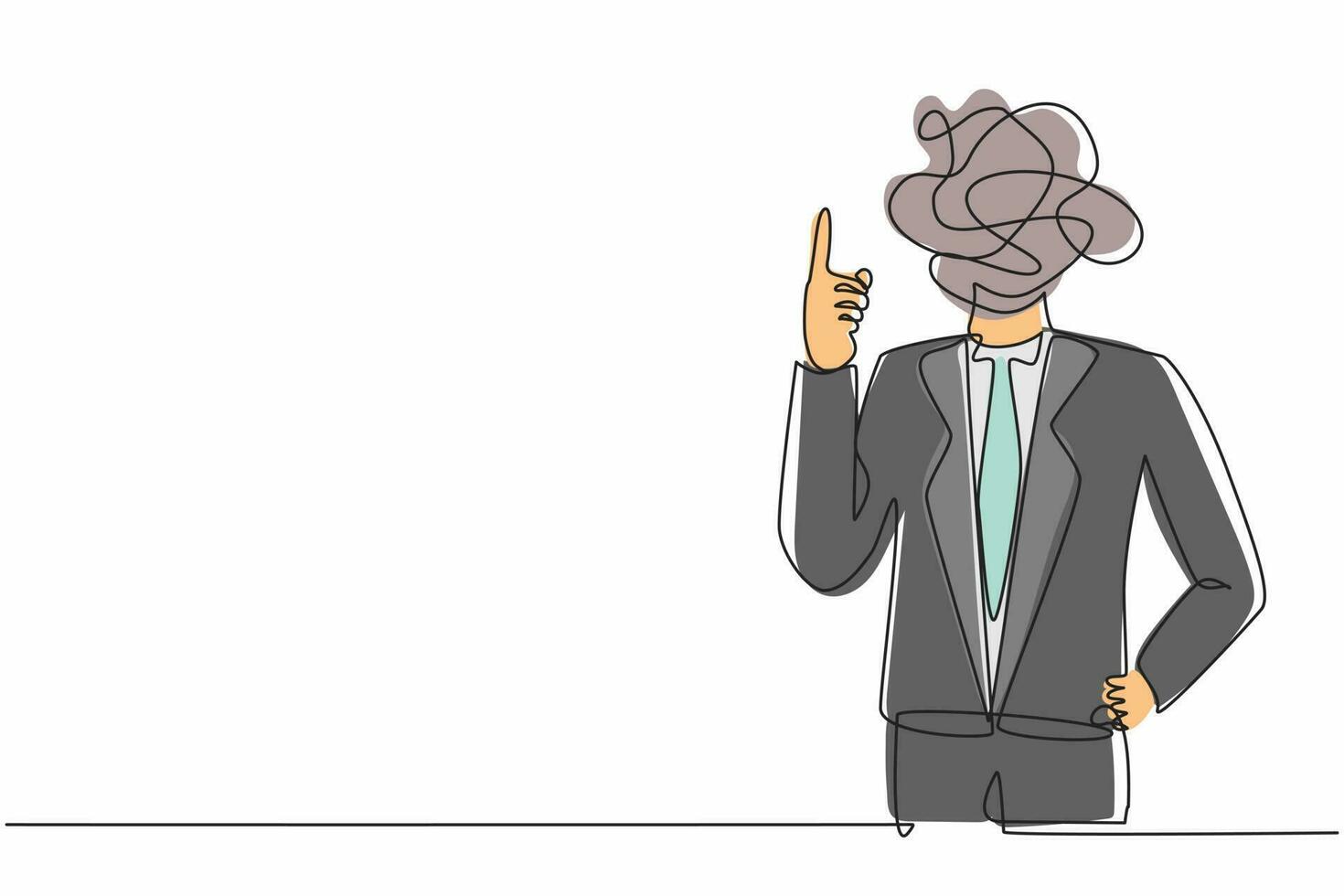 Continuous one line drawing businessman with round scribbles instead of a head. Male manager representing idea, solution. Gesturing or showing index finger. Single line draw design vector illustration Pro Vector