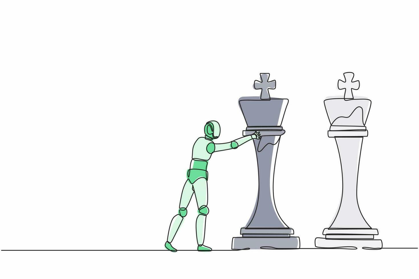 Single one line drawing robot push huge king chess piece to take down the other king. Future technology. Artificial intelligence machine learning process. Continuous line draw design graphic vector Pro Vector