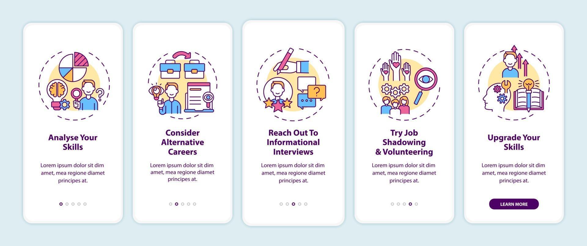 Career change steps onboarding mobile app page screen with concepts Pro Vector