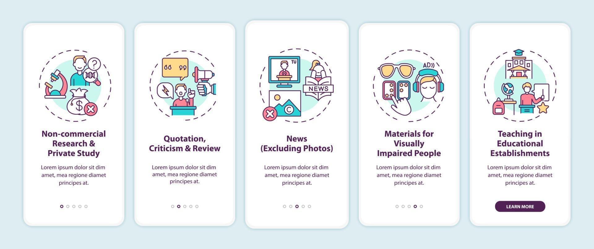 Exceptions to copyright onboarding mobile app page screen with concepts Pro Vector