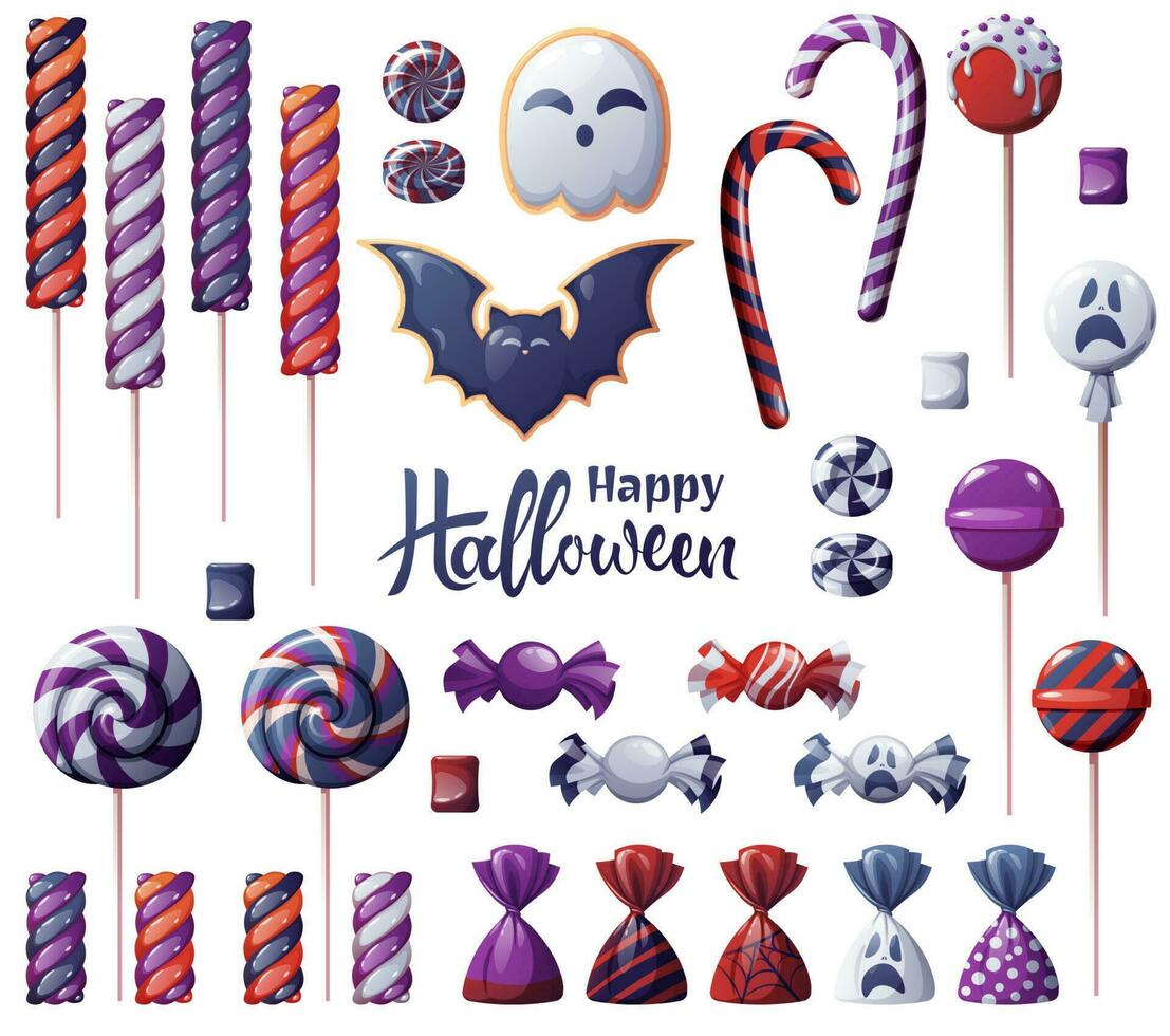 A set of sweets for Halloween. Cookies in the form of a ghost, a bat. Sweet candies and lollipops with a spiral pattern in Halloween style Pro Vector
