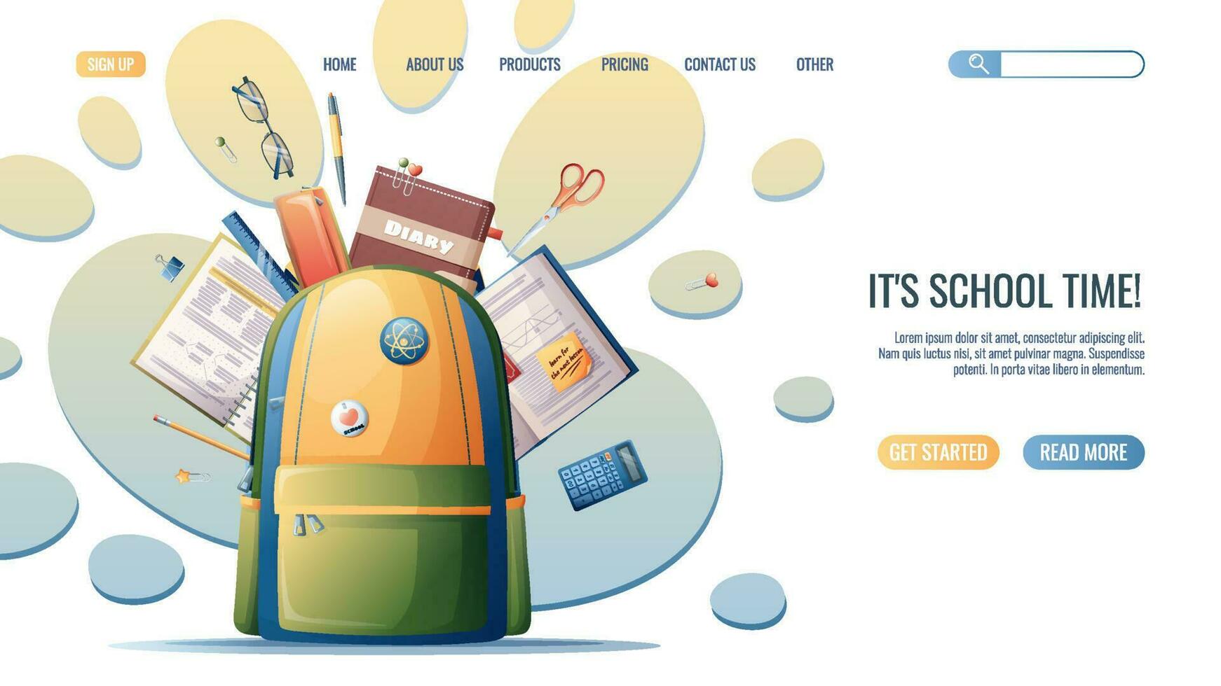 Landing page template with briefcase and flying school items.Back to school landing page template. Flat web banner on white backdrop. Vector flat illustration. Concept web design, website page Pro Vector