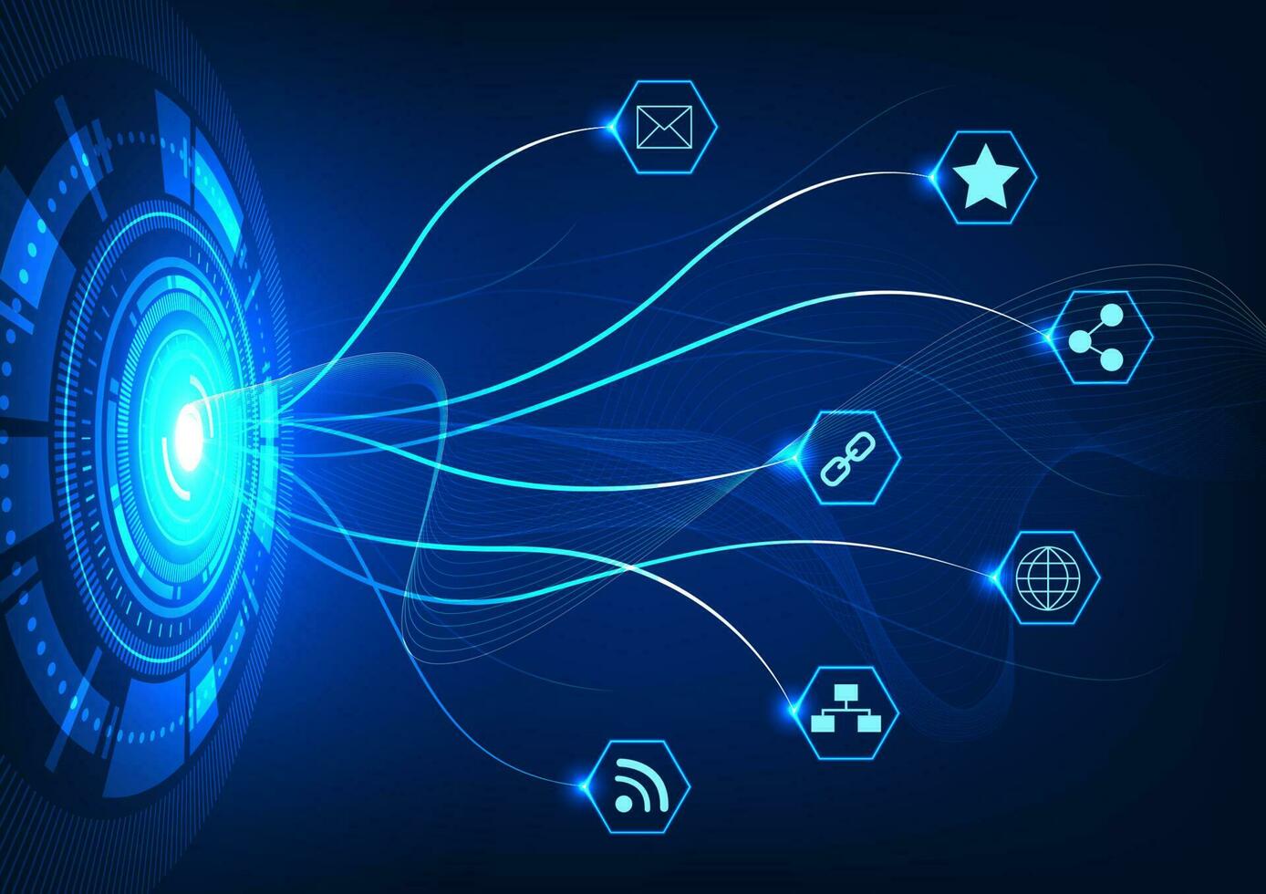 Background technology connection sends data in the internet network into the smart technology that spreads information all over the world data wave display Tech circles with icons in blue tones Pro Vector