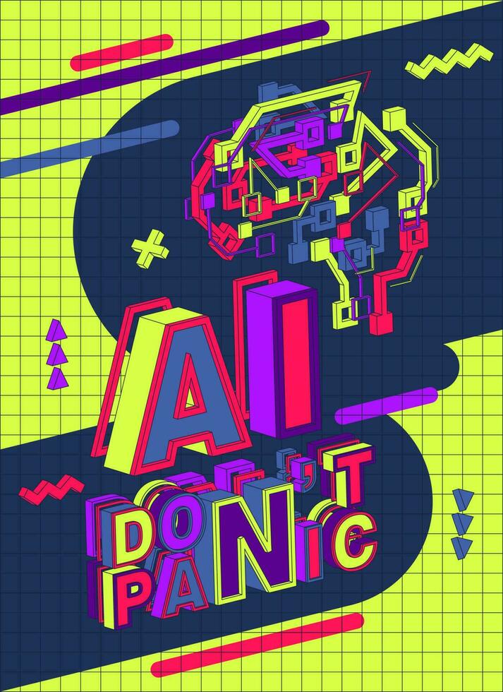 AI, Don't Panic. Artificial Intelligence. 3D Neural Brain Vector Poster. Featuring a graphic 3D neural brain composed of geometric shapes. Pro Vector