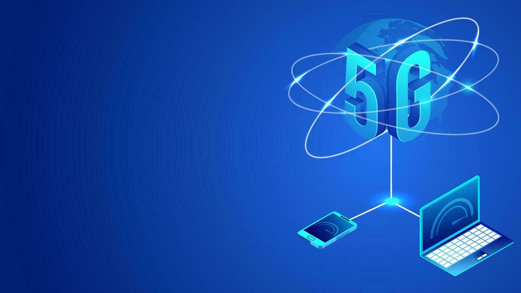 International worldwide 5G data internet network service concept, using internet data service connection of digital device laptop with smartphone on blue background, 3d illustration vector. Pro Vector