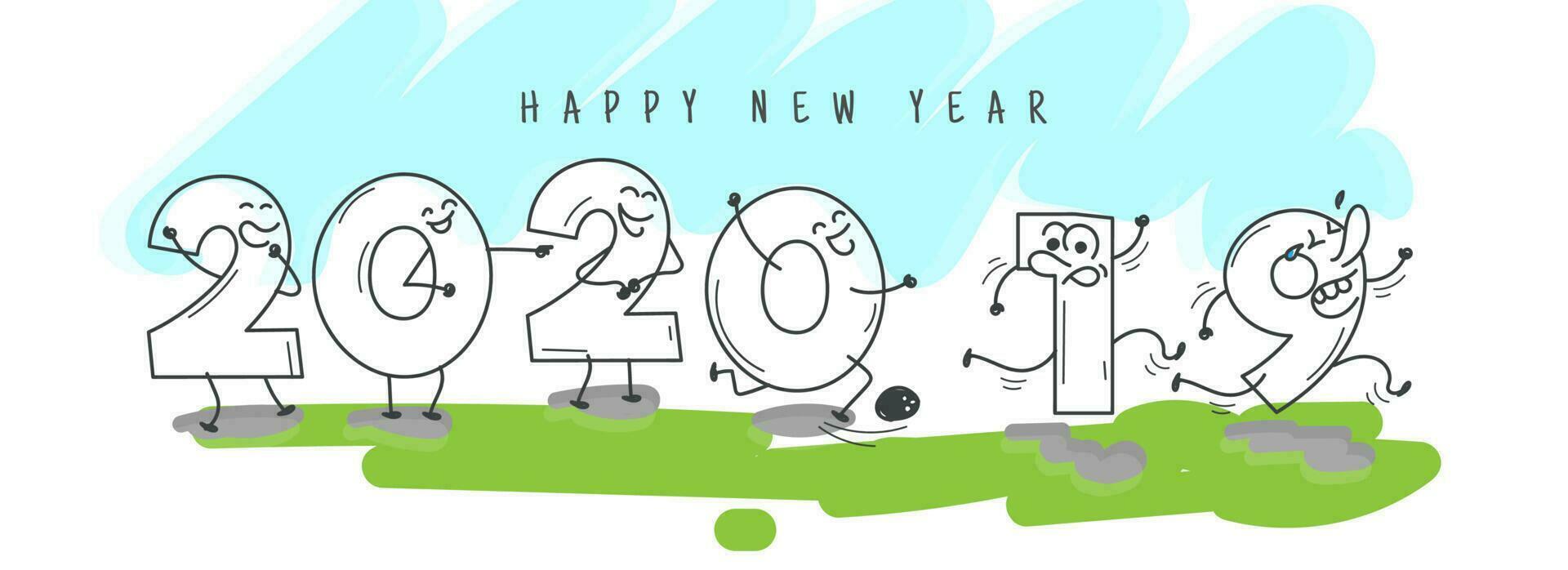 Funny cartoon number of 2020 welcome happy new year and going 2019 on abstract background. Header or banner design. Pro Vector