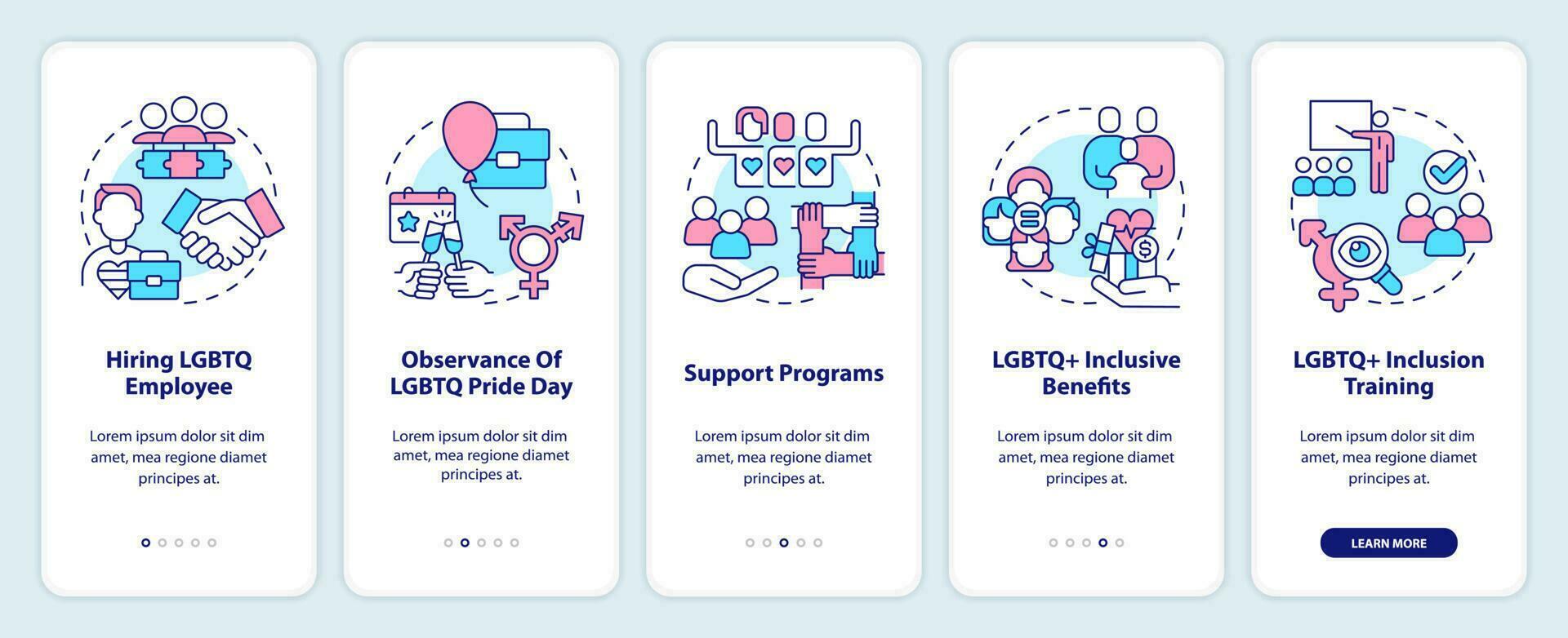 Creating LGBTQ inclusive workplace onboarding mobile app screen. Walkthrough 5 steps editable graphic instructions with linear concepts. UI, UX, GUI template Pro Vector