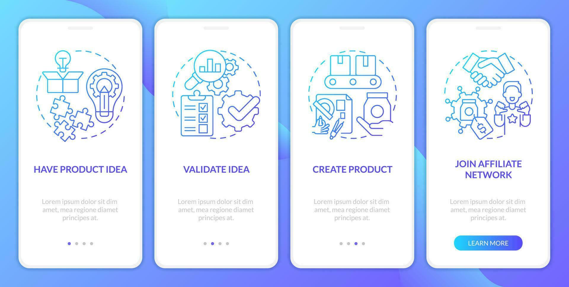 Become affiliate merchant blue gradient onboarding mobile app screen. Ecommerce walkthrough 4 steps graphic instructions with linear concepts. UI, UX, GUI template Pro Vector and Pro SVG