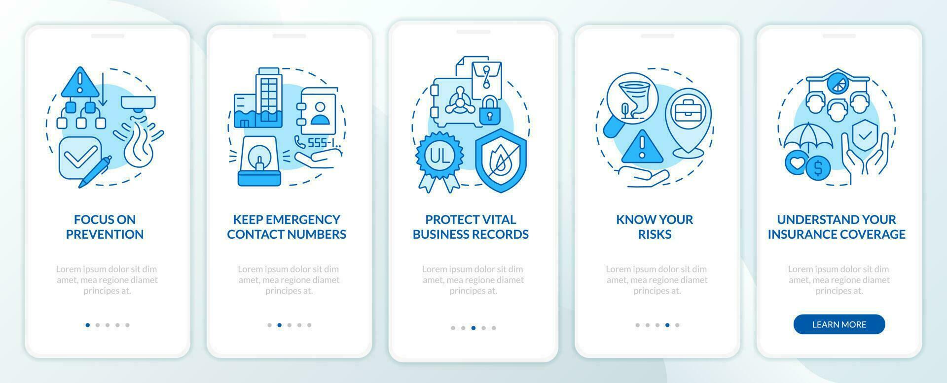 Business disaster planning blue onboarding mobile app screen. Walkthrough 5 steps editable graphic instructions with linear concepts. UI, UX, GUI template Pro Vector and Pro SVG